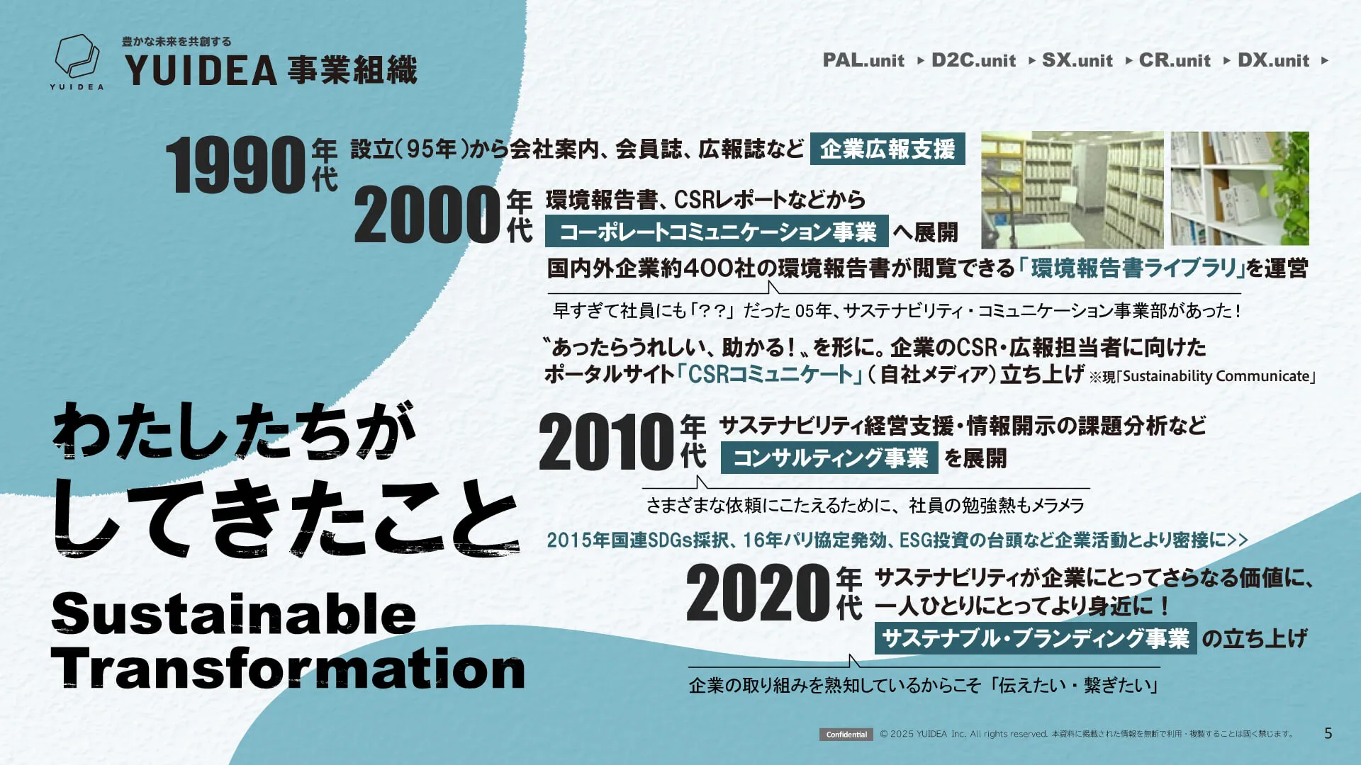 YUIDEAは、2000年より企業のCSR・環境広報支援に携わり、のべ1000社以上のサステナビリティに関する活動・取り組みを支援し、そこで培った専門性や経験を活かして、ウォッシュ(見せかけだけで実態の伴わない様)にならない、サステナブル・ブランディングを支援します。